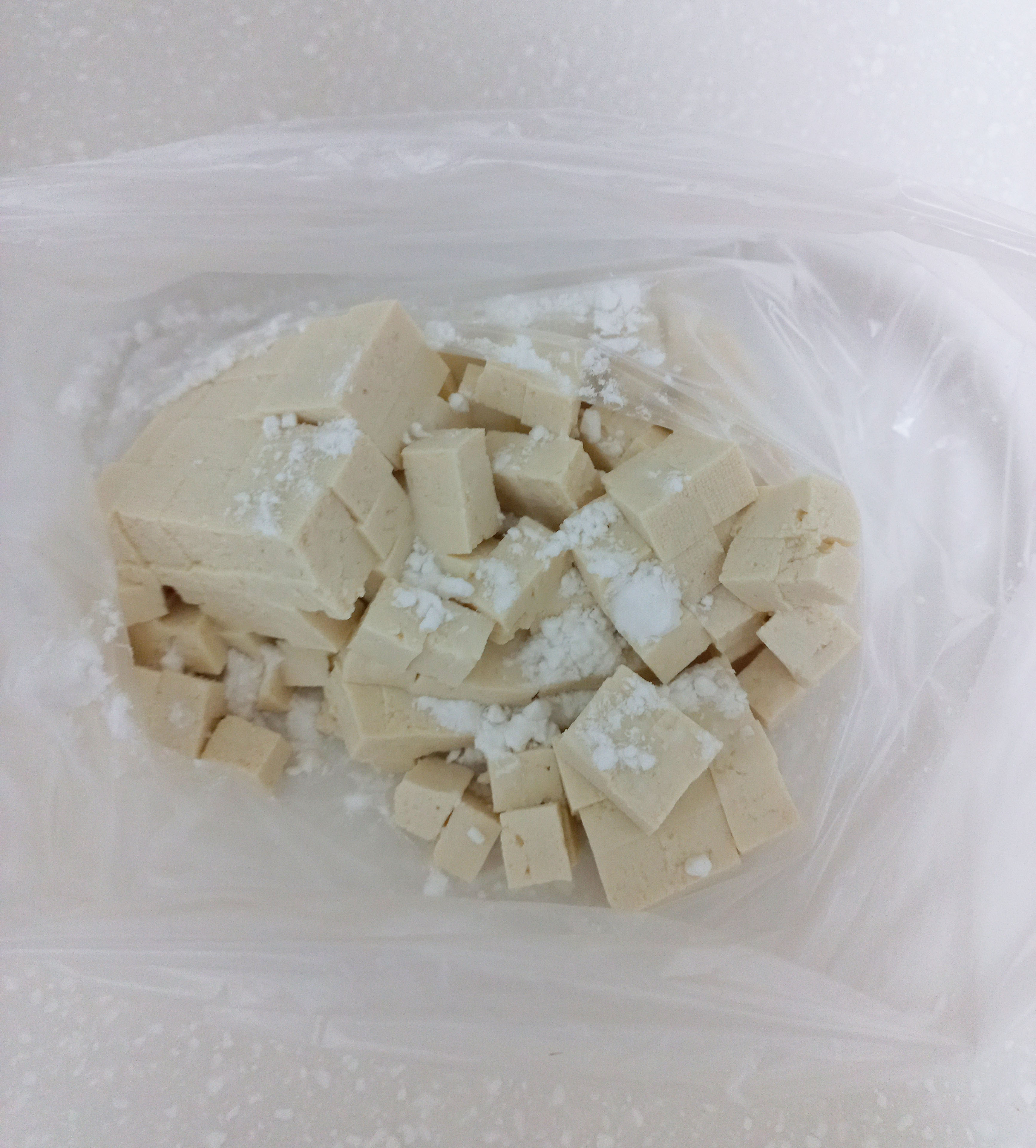일회용 비닐봉지에 두부를 넣고 전분 반숫갈을 넣어주세요.