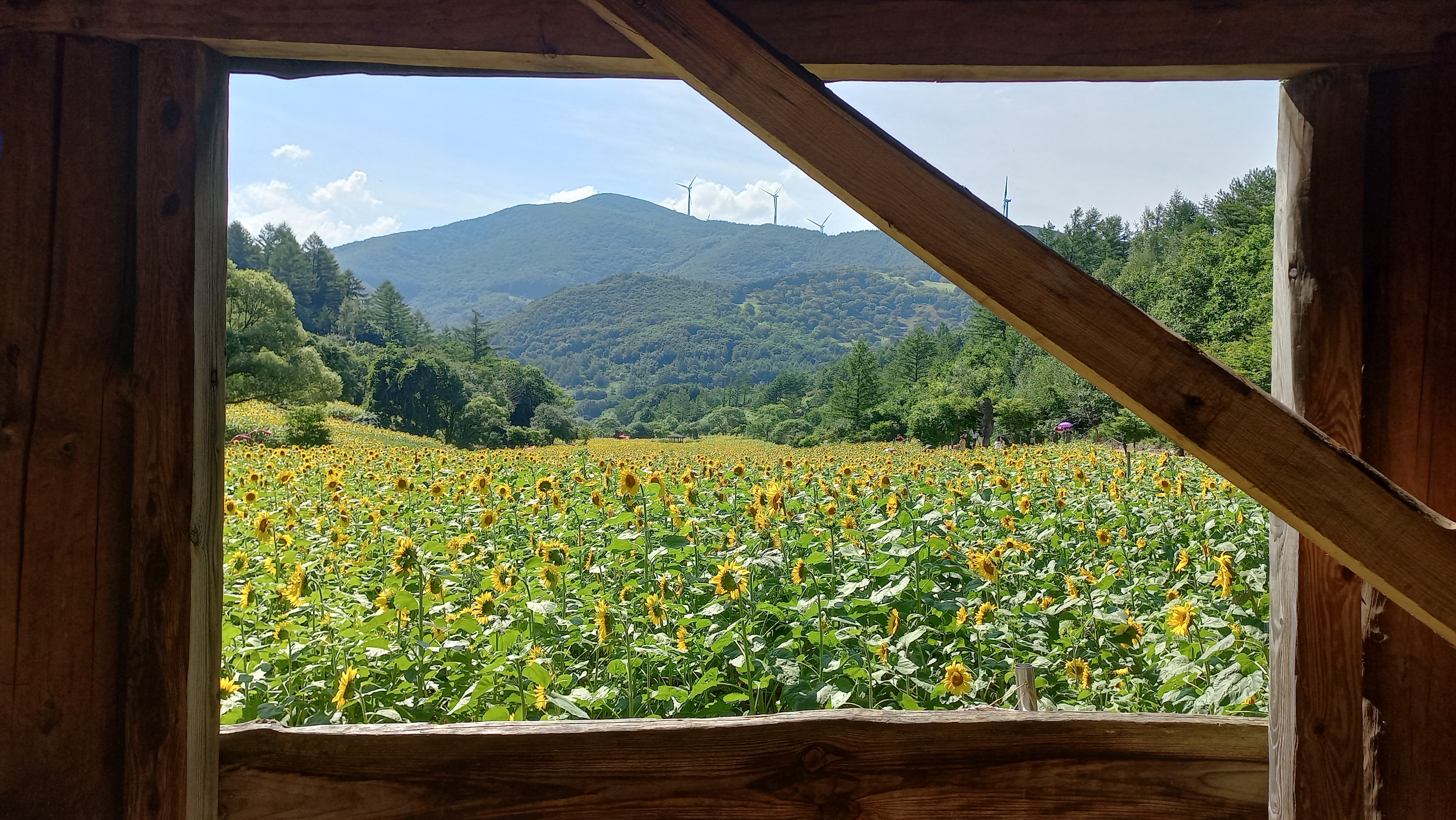 해바라기 밭 끝에 2층으로 된 나무 전망대가 있었어요.